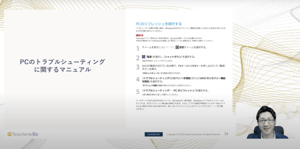 こちらは、同じ内容のマニュアルを「Teachme Biz」で作成したものです。画像や動画で手順が示されるため、専門用語を知らない方でもパソコンを初期化できます。このマニュアルがあれば、誰かに聞かずとも作業を行えます。