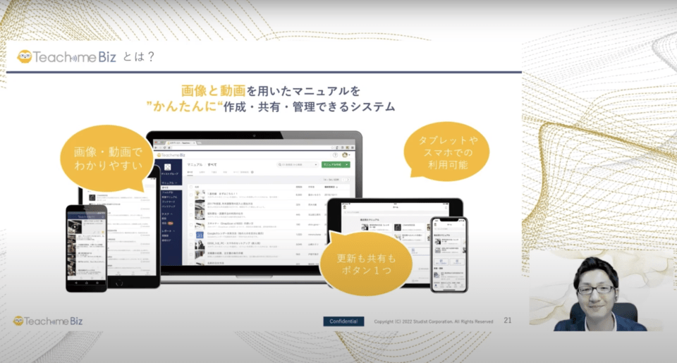 これら現場の課題解決に役立つ「Teachme Biz」とはどのようなサービスなのだろうか。高効率かつ確実な従業員教育を実施できる「Teachme Biz」の魅力を、スタディストの伊藤氏が解説する。