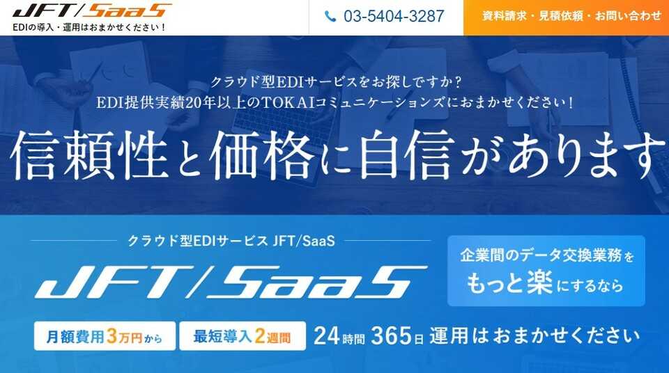 これらいわゆる2024年問題に対応するためには、電話回線網からインターネットを利用したEDIへの移行が一般的です。そこでTOKAIコミュニケーションズでは、クラウド型EDIサービス「JFT-SaaS」を提供。