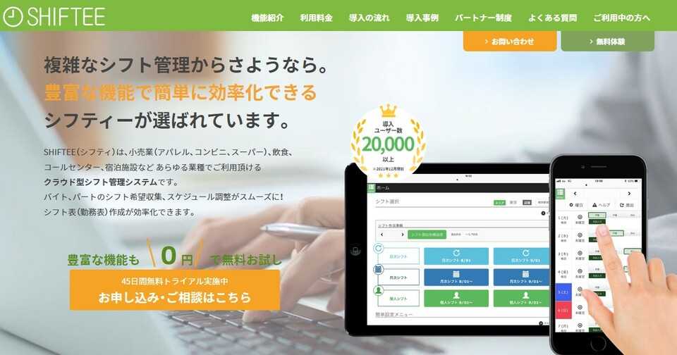 「SHIFTEE」は、クラウド型のシフト管理システムです。小売業や飲食業だけでなく、物流センターやコールセンターなど、シフト管理が必要なさまざまな業種に対応しています。