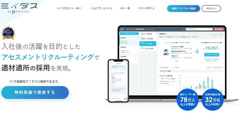 「ミイダス」は、最新の科学的な手法を用いて採用・転職におけるミスマッチを減らしながら入社後の活躍をサポートする採用・転職サービスです。