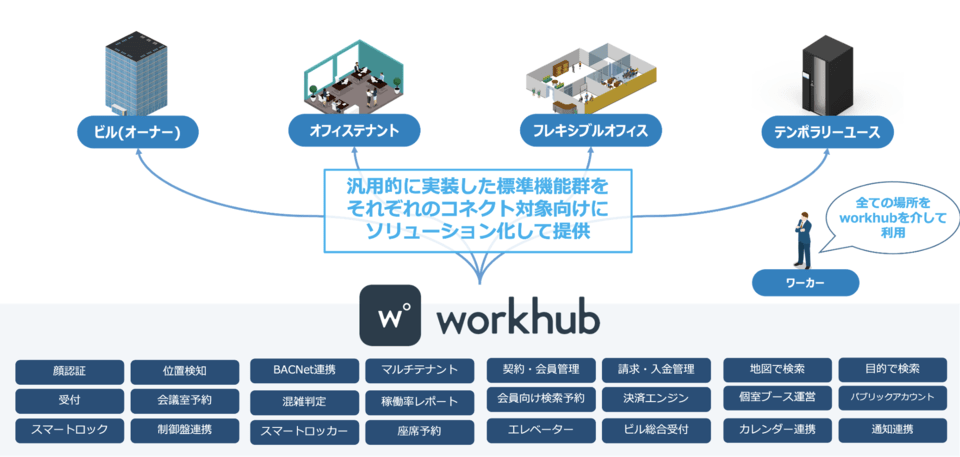 workhub(ワークハブ)はオフィスやコワーキングスペースなど、様々なワークスペースの利便性を向上させるオール・イン・ワンのプラットフォームです。導入時は既存のビル設備との連携や、後付け可能なハードウェアを利用することで、大規模工事を行わずともビル共用部から・テナント専有部までワークスペース全体をアップデートさせることが可能なため、低コストで真のABWを実現できます。