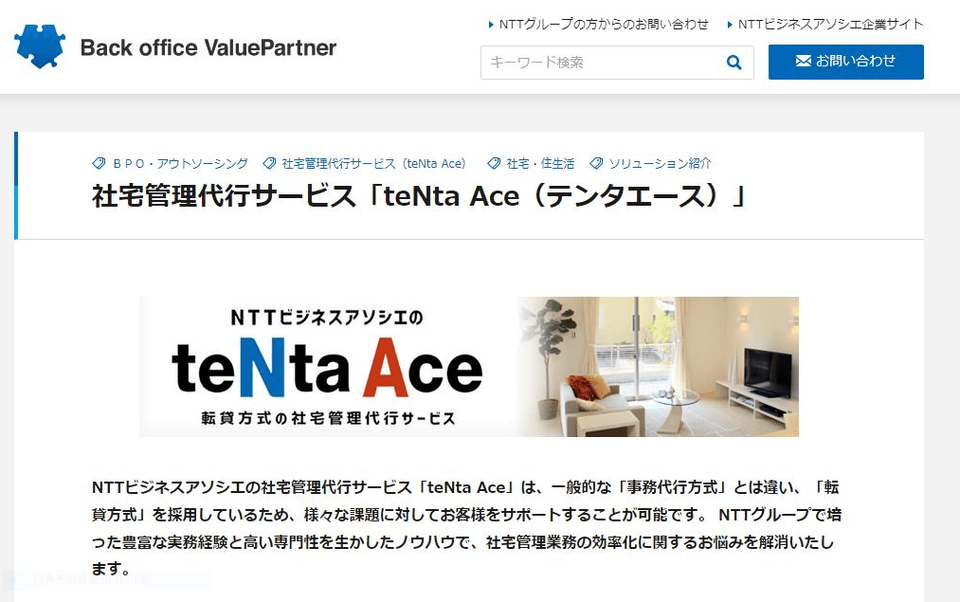 「teNta Ace(テンタエース)」は、煩雑な社宅管理を自社に変わって行ってもらえる社宅管理代行サービスです。