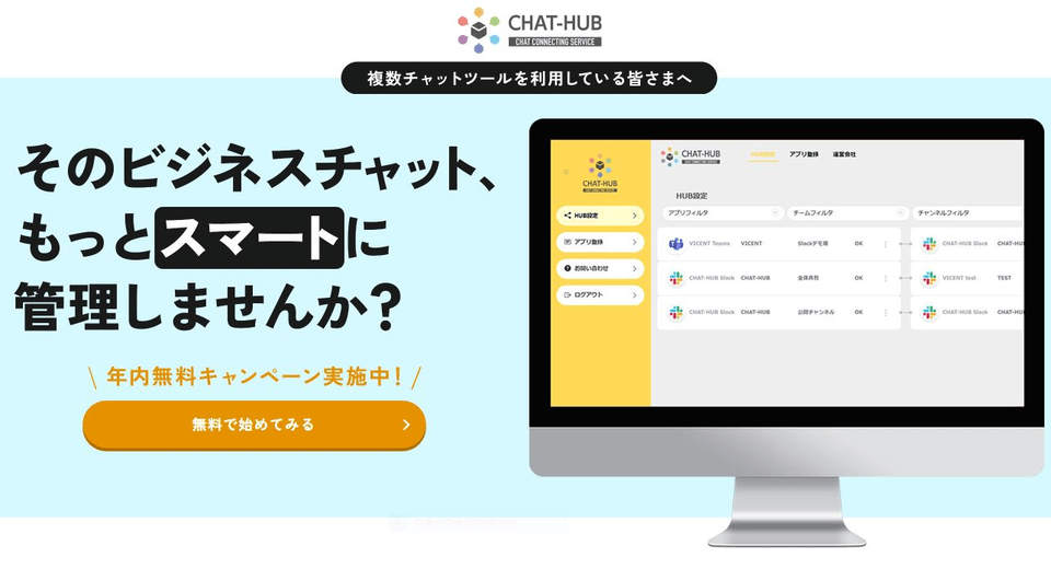 「CHAT-HUB」は、複数のビジネスチャットツールにまたがる情報を一元管理できるクラウドサービスです。