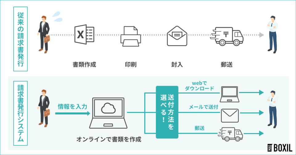 手作業で請求書を作成したり、印刷、郵送する時代はもう終わり!請求書発行システムで、もっと業務を楽にしちゃいましょう。
