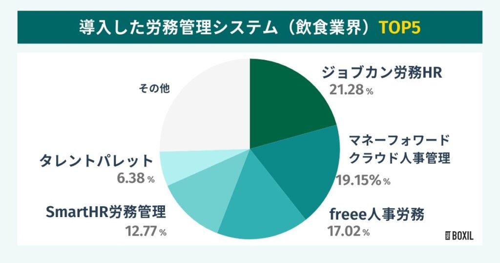 BOXILのアンケート※によると、シェアの最も多かった労務管理システムは「ジョブカン労務HR」で21.3%、次いで「マネーフォワード クラウド人事管理」が19.1%、「freee人事労務」が17%でした。
