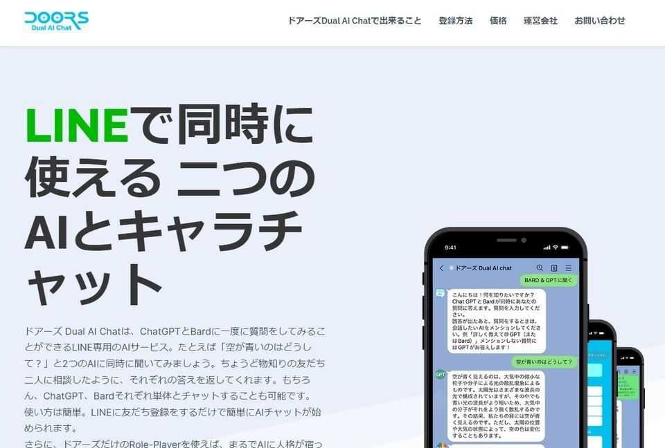 ドアーズ Dual AI Chatは、これまでパソコンで利用していたAIチャットボットをLINEで実現。また、ChatGPTとGoogle Bardの両方を利用できることも特徴です。