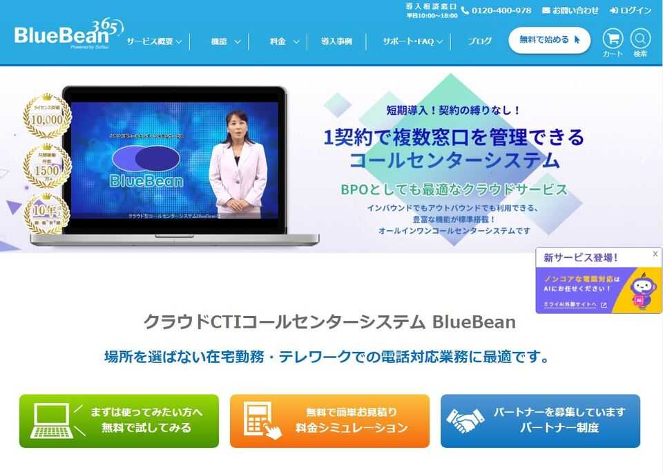 「BlueBean」は、遠隔地からでもコールセンター業務が可能になる、クラウド型のコールセンターシステムです。