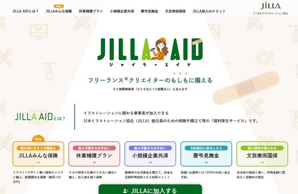 「JILLA AID」は、協同組合日本イラストレーション協会が提供する、フリーランスとして活躍するクリエイター向けの福利厚生サービスです。