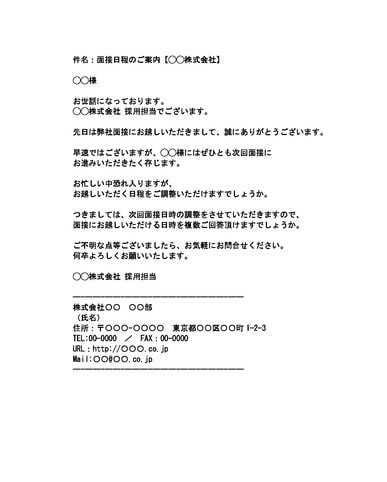 - 「お忙しい中恐れ入りますが、お越しいただく日程をご調整いただけますでしょうか。つきましては、次回面接日時の調整をさせていただきますので、下記の候補日のご都合はいかがでしょうか、1.●月●日●●:●●~●●:●●、2.●月●日●●:●●~●●:●●~(候補日を記載する)」