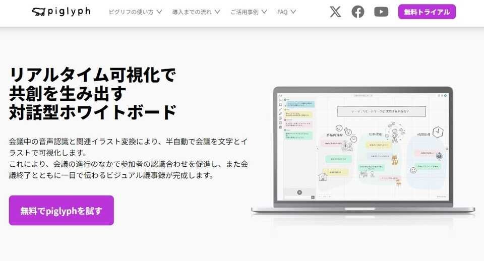 「piglyph」 は、会議内容のテキスト化やイラスト化をリアルタイムに実現する対話型オンラインホワイトボードです。