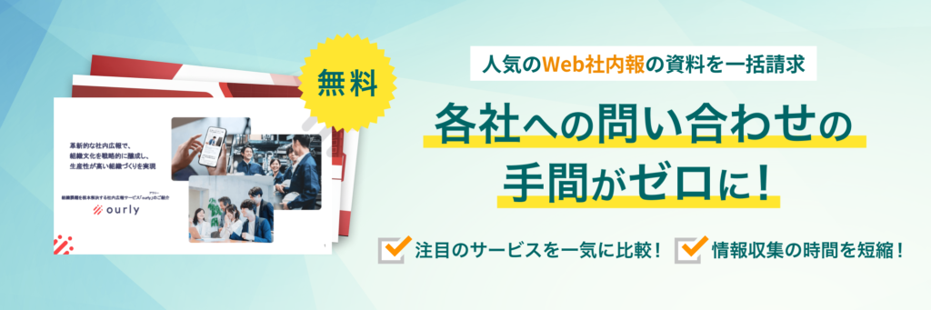 おすすめWeb社内報サービスの資料を厳選。各サービスの料金プランや機能、特徴がまとまった資料を無料で資料請求可能です。ぜひWeb社内報サービスを比較する際や稟議を作成する際にご利用ください。