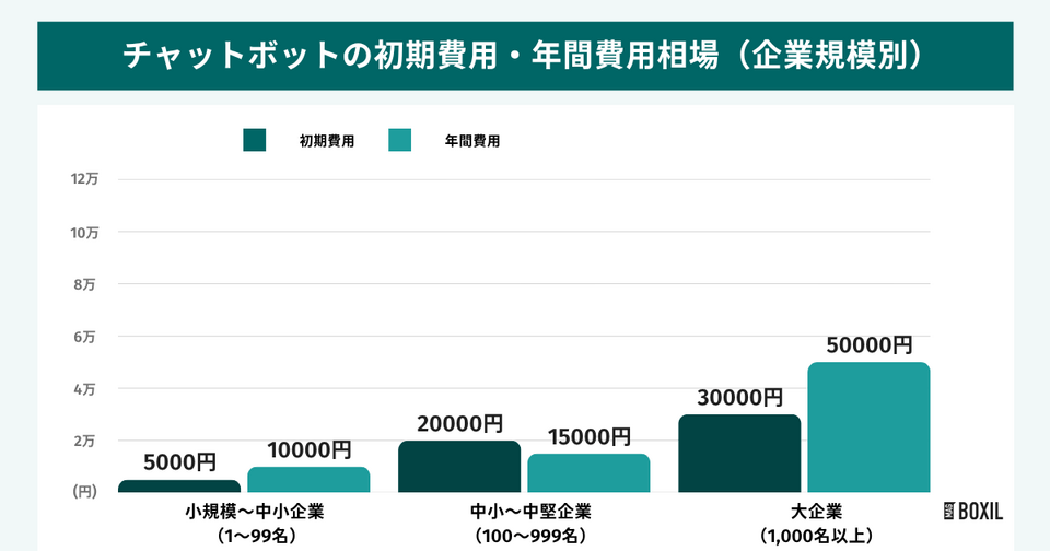 BOXILで取得したアンケート※によると、チャットボットの費用相場※1は、初期費用が2万円、年間費用が15,000円でした。年額費用を12で割って計算すると、月額費用の相場は約1,300円ほどです。