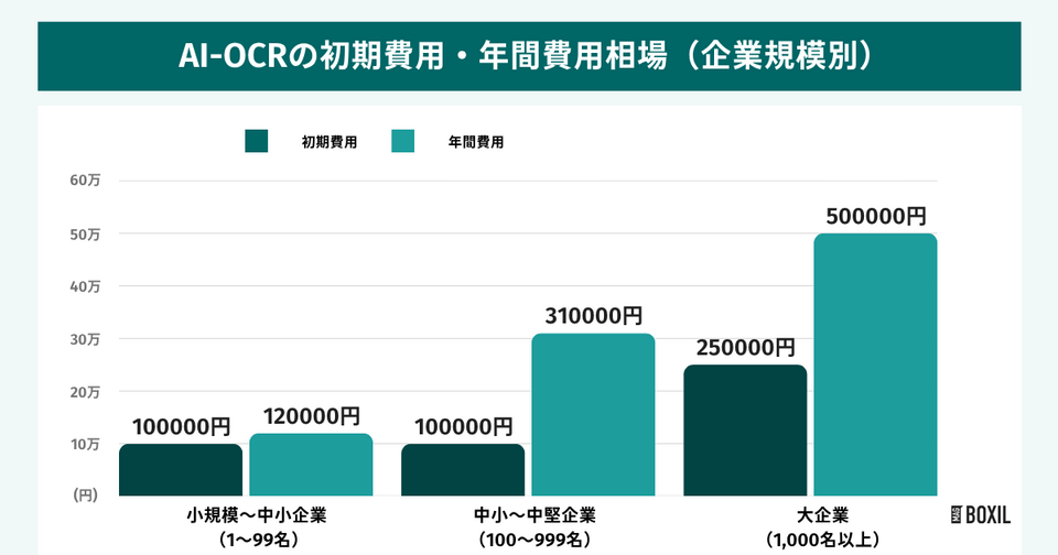 BOXILで取得したアンケート※によると、AI-OCRの費用相場※1は、初期費用が10万円、年間費用が30万円でした。年額費用を12で割って計算すると、月額費用の相場は約25,000円ほどです。
