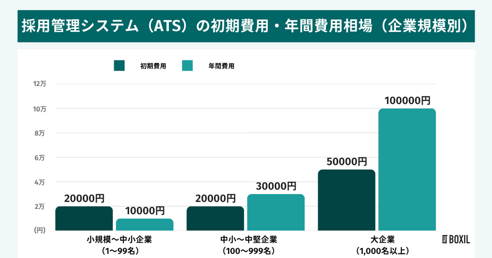 BOXILで取得したアンケート※によると、採用管理システム(ATS)の費用相場※1は、初期費用が2万円、年間費用が3万円でした。年額費用を12で割って計算すると、月額費用の相場は約2,500円ほどです。