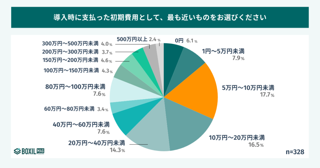 月額費用とは別に、導入時にかかった初期費用の総額について尋ねたところ、最も回答が多かったのは「5万円~10万円未満」で17.7%でした。続く「10万円〜20万円未満(16.5%)」「20万円〜40万円未満(14.3%)」と合わせると、全体の48.5%を占めます。このことから、採用代行サービス(RPO)の初期費用の相場は5万円~40万円未満と言えます。