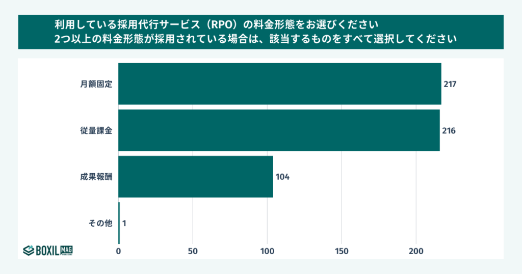 さらに、利用している採用代行サービス(RPO)の料金形態(複数回答可)を尋ねると、最多の回答月額固定(217人)でした。続く、従量課金(216人)がほぼ同数であることから、採用代行サービス(RPO)の料金形態は月額固定と従量課金が主流と言えます。
