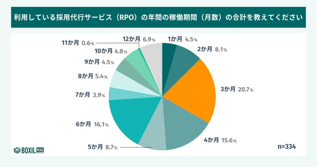 利用している採用代行サービス(RPO)の年間の稼働期間については、最多が「3か月(20.7%)」、次点に「6か月(16.1%)」「4か月(15.6%)」と続き、12か月継続して利用した企業は6.9%にとどまりました。