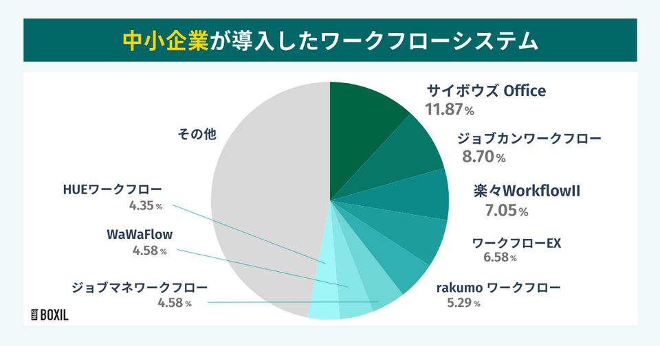 中小企業でのシェア率1位は サイボウズ Office で、全体の11.87%でした。次いで ジョブカンワークフロー が8.70%、 楽々WorkflowII が7.05%、 ワークフローEX が6.58%、 rakumo ワークフロー 5.29%と続きます。