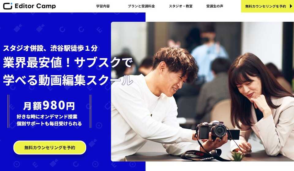 エディターキャンプは、厚生労働省の「一般教育訓練制度」に選ばれたスクールのため、月額980円(税込)からという少ない費用でしっかりと動画編集スキルを身につけられる利点があります。