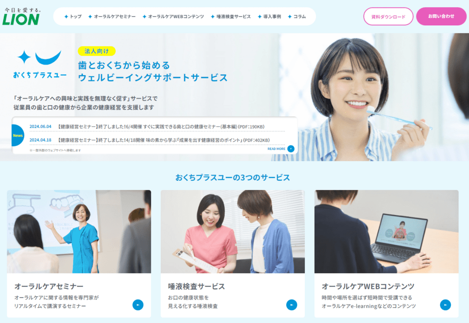 ライオンのおくちプラスユー は、従業員のオーラルケアで健康増進を促進する法人向けの健康経営支援サービスです。