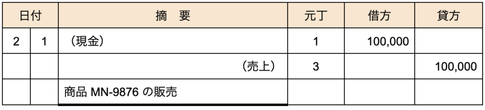 2月1日、商品MN-9876を販売して、現金での売上が10万円ありました。この仕訳の起票の流れは次のとおりです。