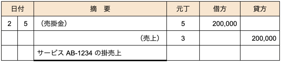 2月5日に20万円のサービスAB-1234を掛取引で販売した場合の仕訳帳は下記のとおりです。商品代金が未受領であるため、借方に売掛金20万円、貸方に売上20万円と起票します。
