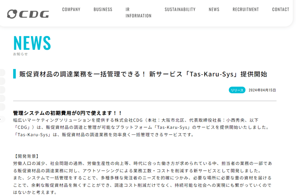 Tas-Karu-Sysは、販促資材の調達から管理までを一括で任せられるサービスです。