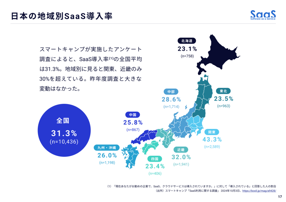 SaaSの導入率を地域別にまとめた。全国平均は31.3%で、関東、近畿のみ30%を超え、もっとも多い関東は43.3%だった。