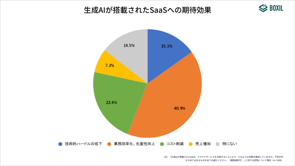 SaaSにも生成AIを組み込んで提供する動きが本格化しており、米大手を中心に実装が進んでいる。そうした生成AI搭載SaaSを念頭に置き、期待効果を尋ねたところ、「業務効率化、生産性向上」(40.9%)、「コスト削減」(22.4%)、「技術的ハードルの低下」(15.1%)、「売上増加」(7.2%)の順に多かった。