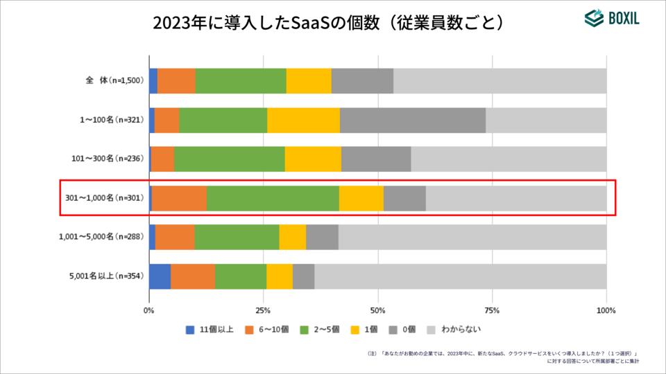 2023年に新たに導入したSaaSの個数について尋ねると、全体の39.8%が1個以上導入していた。所属企業の従業員数ごとに集計したところ、唯一「301〜1,000名」でSaaSの新規導入が半数を超えた。中堅企業※に相当する企業が多く含まれる。