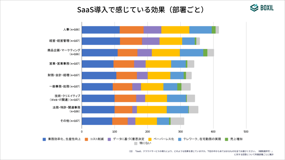 SaaS導入による効果について尋ねると、「業務効率化、生産性向上」が全部署でもっとも多かった。部署によって差があった項目は「データに基づく意思決定」で、「人事」「経営・経営管理」では約30%が選択している一方、「法務・特許・関連事務」では約8%と、20ポイント以上の差が開いた。