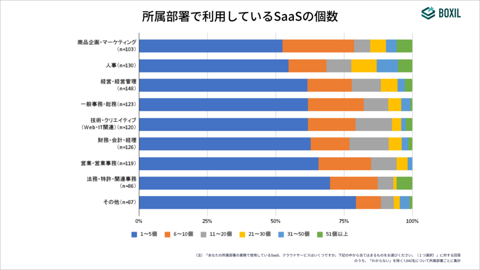 所属部署の業務で利用しているSaaSの個数については、「商品企画・マーケティング」「人事」で比較的多い一方、「法務・特許・関連事務」では70%近くが「1〜5個」と回答している。ただし「51個以上」が他部署より多く、全社で多くのSaaSが導入されている、比較的規模の大きい企業に勤めている方が多く含まれると推察している。