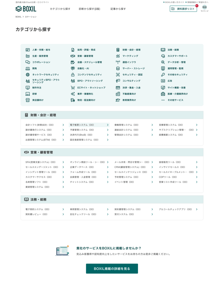 課題が明確な場合は「勤怠管理システム」や「電子契約システム」などの具体的なカテゴリをチェックしましょう。「どのシステムを選べばいいかわからない」という方は、「人事・労務・給与」や「マーケティング」のような職種から選んで探してみてください。