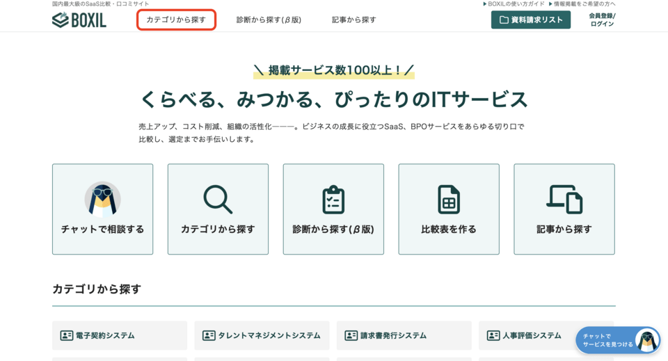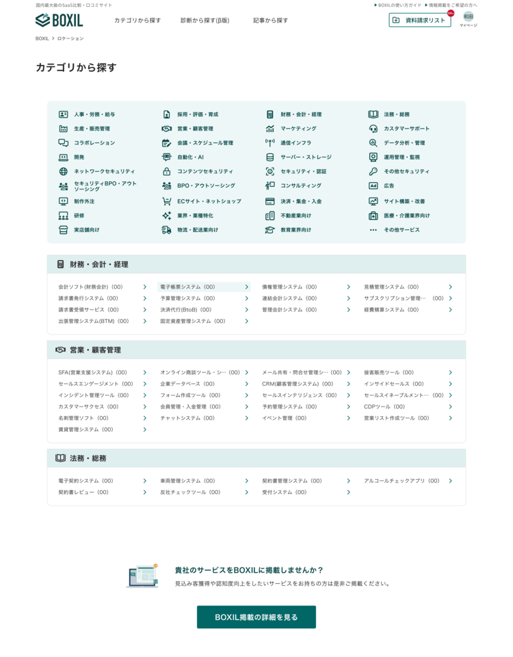 課題が明確な場合は「 勤怠管理システム 」や「 電子契約システム 」などの具体的なカテゴリをチェックしましょう。「どのシステムを選べばいいかわからない」という方は、「人事・労務・給与」や「マーケティング」のような職種から選んで探してみてください。