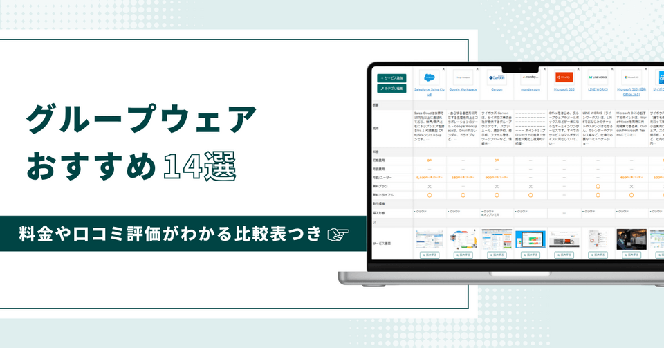 「SaaS導入推進者が選ぶサイト第1位」のボクシルが、おすすめグループウェア14選を厳選しました。さらに、各サービスの料金・機能をまとめた『比較表』もご用意。グループウェアが気になる方は、『比較表』を使って自社に合うサービスを探してみてください。