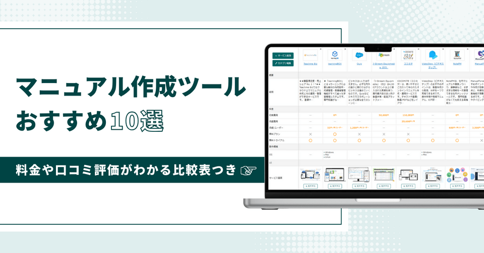 「SaaS導入推進者が選ぶサイト第1位」のボクシルが、おすすめマニュアル作成ツール10選を厳選しました。さらに、機能・料金をまとめた『比較表』もご用意。導入を検討している方は、『比較表』を使って自社に合うツールを探してみてください。