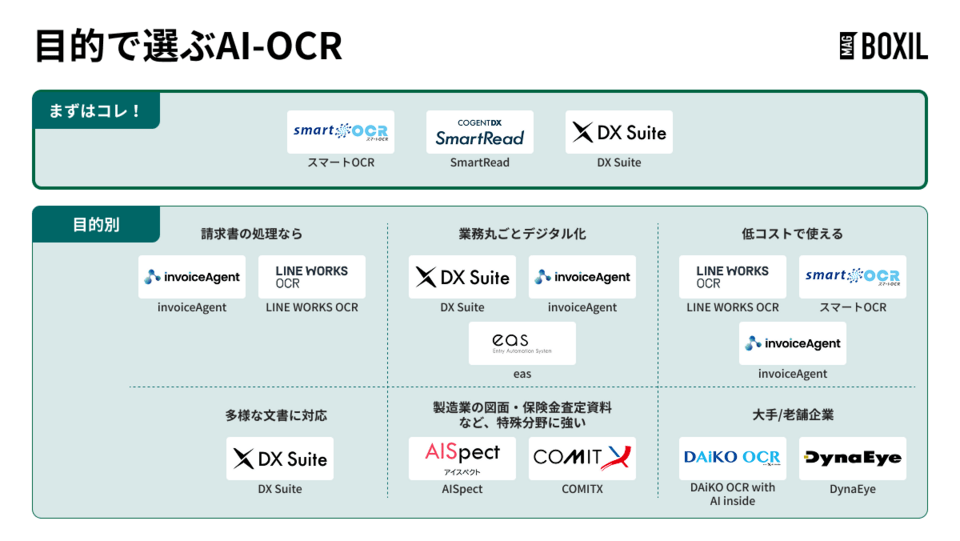 導入者数が多いスマートOCR、SmartRead、DX Suiteは、まず最初の候補としておすすめです。