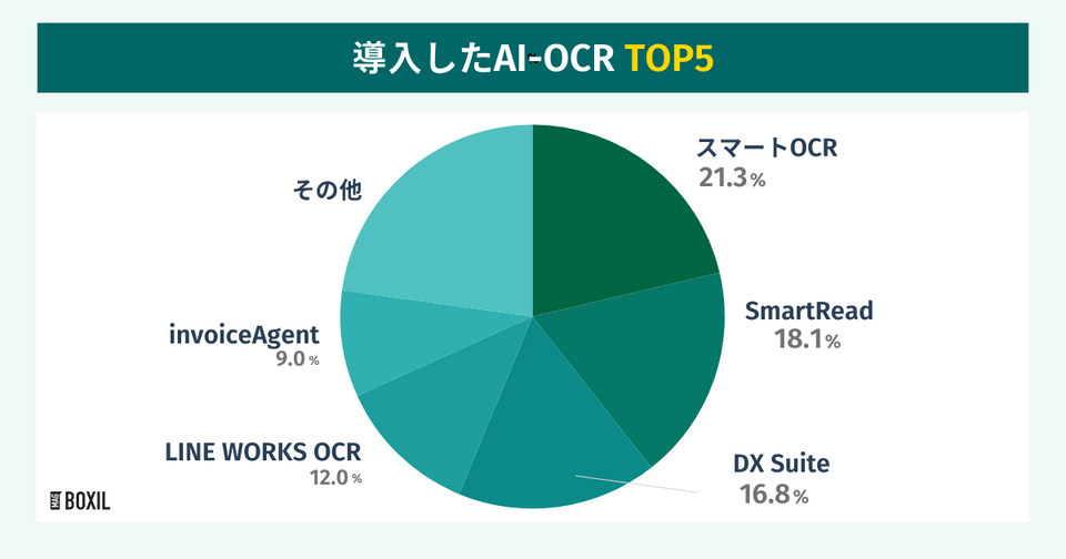 スマートキャンプ株式会社のアンケート※によると、シェアの最も多かったAI-OCRは「スマートOCR」で21.32%、次いで「SmartRead」が18.07%、次いで「DX Suite」が16.84%でした。続く「LINE WORKS OCR」「invoiceAgent」と合わせた5ツールにて77.2%のシェアを占めています。