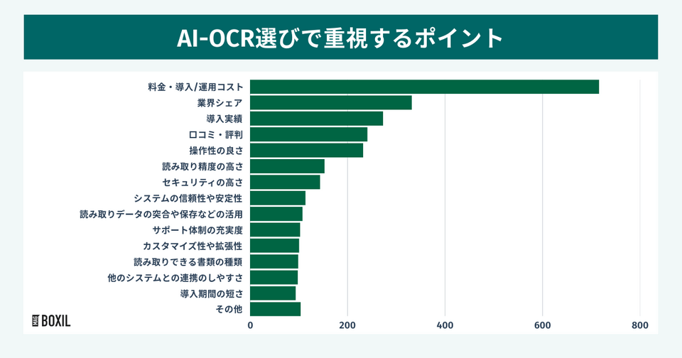 AI-OCR選びで最も重視されているのは「料金・導入/運用コスト」で、なるべく低コストで導入したいニーズが高いようです。