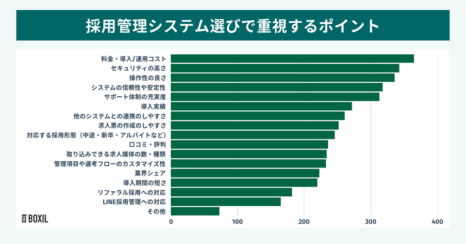 担当者が最も気にするのは「料金(導入・運用コスト)」の観点でしたが、応募者の個人情報を扱うことから「セキュリティの高さ」も重要視している人が多いようです。