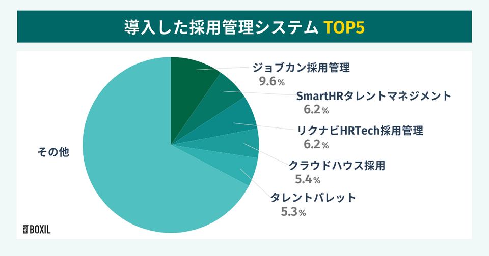 スマートキャンプ株式会社のアンケート※によると、シェアの最も多かった採用管理システムは「ジョブカン採用管理」で9.6%、次いで「SmartHRタレントマネジメント」と「リクナビHRTech採用管理」が同率で6.2%でした。