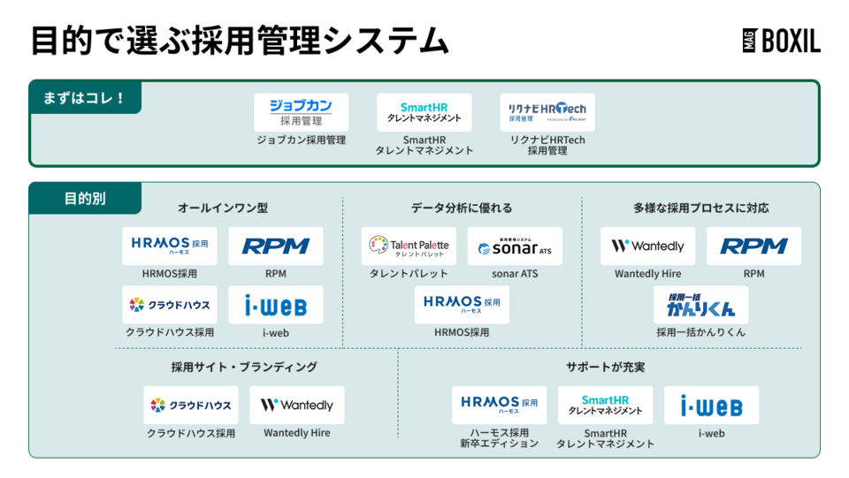 採用管理システムを選ぶときは、導入の目的にあわせて候補を絞るとよいでしょう。