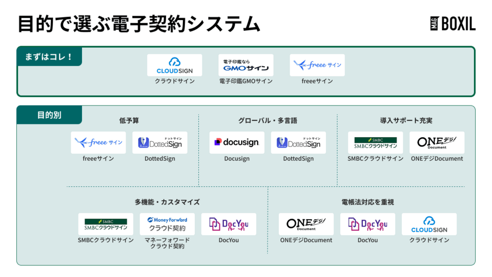 電子契約システムを選ぶときは、導入の目的にあわせて候補を絞るとよいでしょう。なかでも、導入者数の多いクラウドサイン、電子印鑑GMOサイン、freeeサインがおすすめです。