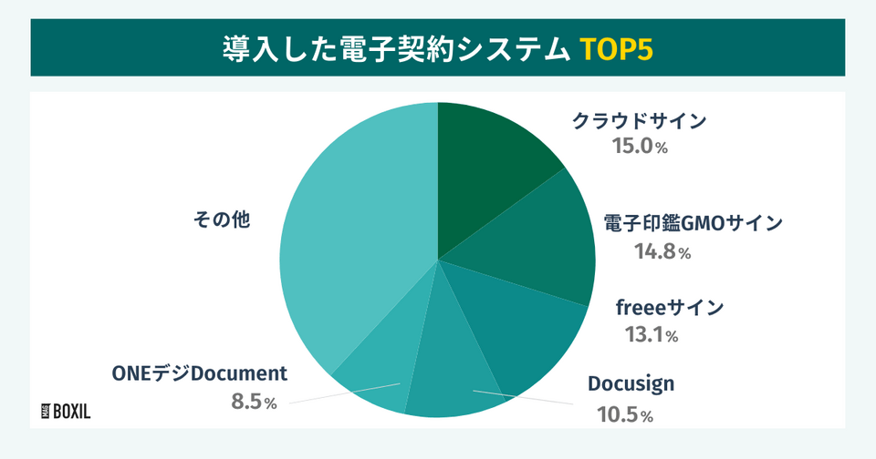 スマートキャンプ株式会社のアンケート※によると、シェアの最も多かった電子契約システムは「クラウドサイン」で15.0%、次いで「電子印鑑GMOサイン」が14.8%、次いで「freeeサイン」が13.1%でした。続く「Docusign」「ONEデジDocument」と合わせた5システムにて61.9%のシェアを占めています。
