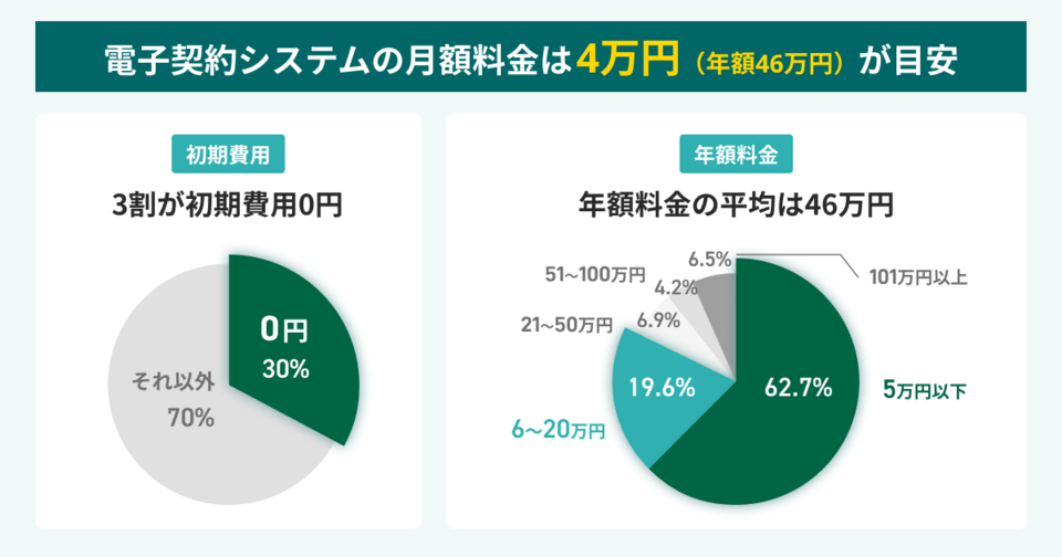 調査の結果、約3割のユーザーが初期費用0円で電子契約システムの利用を開始しています。年額費用の平均は46万円で、1か月あたりおよそ4万円です。