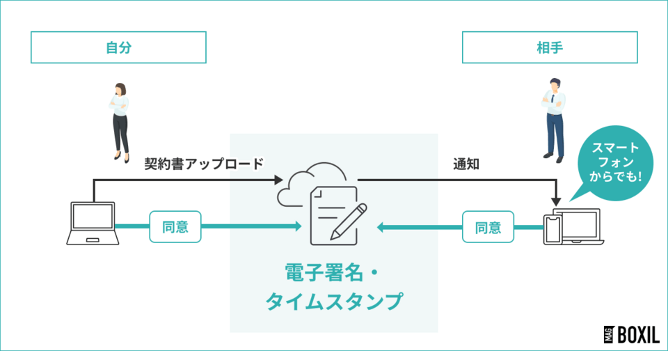 電子契約システムでは、契約書をクラウド上にアップロードし、両者が電子署名で同意するだけで契約が完了します。