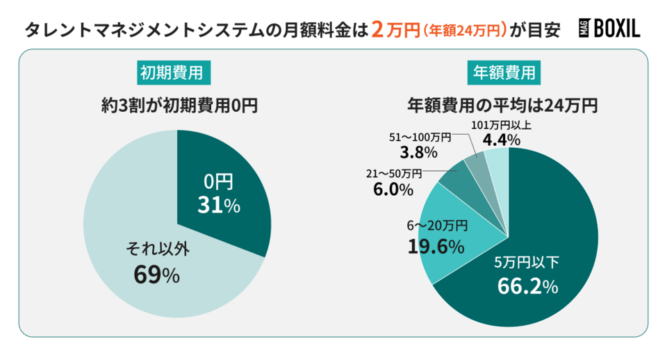 調査の結果、約3割のユーザーが初期費用0円でタレントマネジメントシステムの利用を開始しています。年額費用の平均は24万円で、1か月あたりおよそ2万円です。