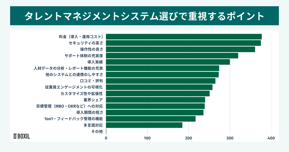調査結果から、導入担当者が最も重視するのは「料金(導入・運用コスト)」であることがわかります。これは人材管理システムが長期的に使用するツールであり、継続的なコスト負担が発生するためでしょう。