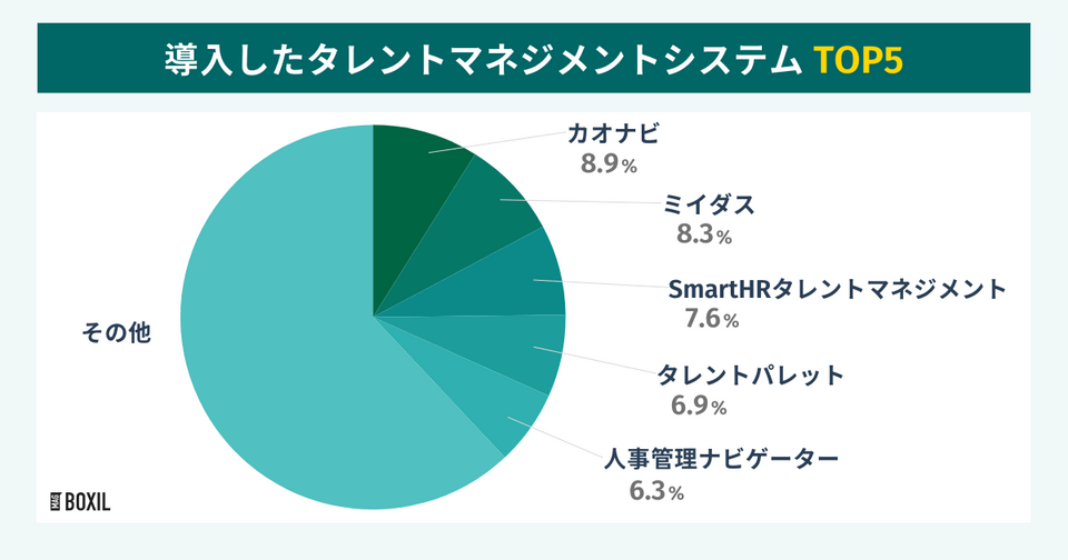 スマートキャンプ株式会社のアンケート※によると、シェアの最も多かったタレントマネジメントシステムは「カオナビ」で8.9%、次いで「ミイダス」が8.3%、次いで「SmartHRタレントマネジメント」が7.6%でした。続く「タレントパレット」「人事管理ナビゲーター」と合わせた5システムにて38%のシェアを占めています。